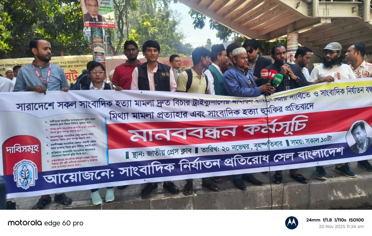 সারাদেশে সাংবাদিক হত্যা মামলার দ্রুত বিচার ট্রাইব্যুনালের মাধ্যমে নিষ্পত্তি, সাংবাদিকদের ওপর নির্যাতন-নিপীড়ন বন্ধ, মিথ্যা মামলা প্রত্যাহার এবং হত্যার হুমকির প্রতিবাদে মানববন্ধন কর্মসূচি পালন করেছে সাংবাদিক নির্যাতন প্রতিরোধ সেল বাংলাদেশ। বৃহস্পতিবার (২০ নভেম্বর) সকালে জাতীয় প্রেসক্লাবের সামনে এ মানববন্ধন অনুষ্ঠিত হয়। এতে দেশের বিভিন্ন এলাকার সাংবাদিকরা অংশ নেন।