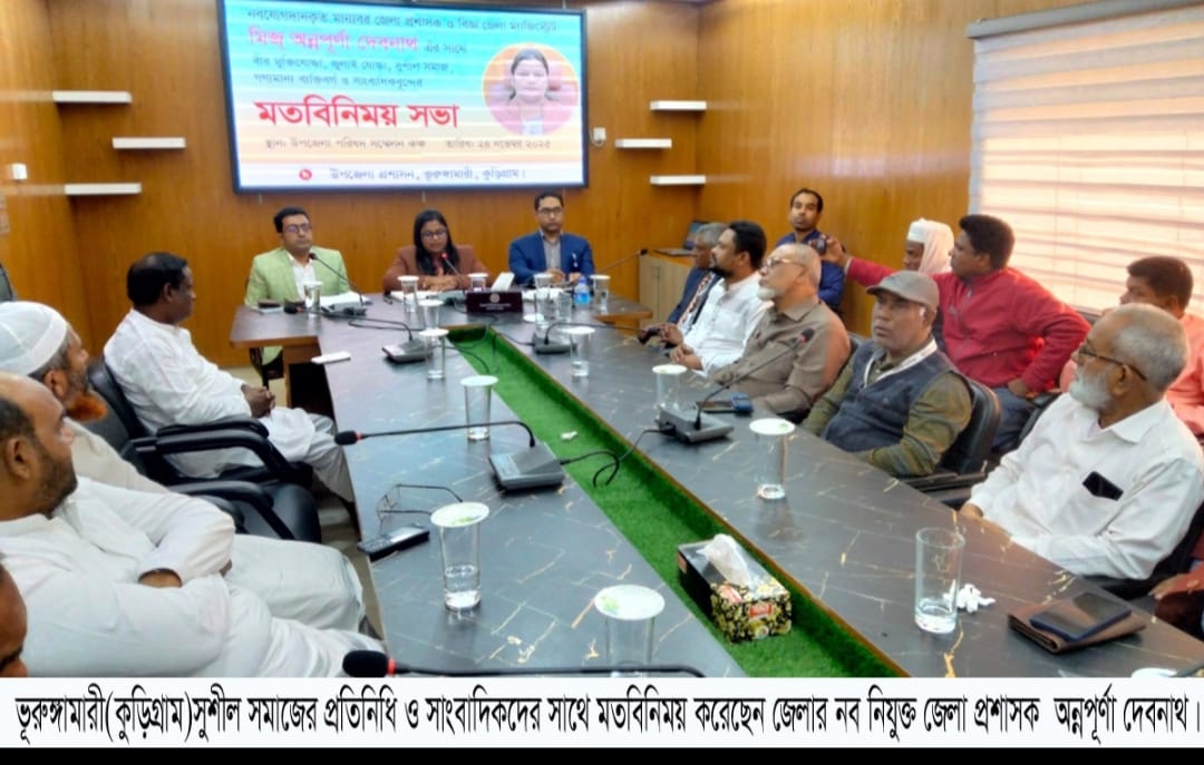 নব নিযুক্ত জেলা প্রসাশক (ডিসি) অন্নপূর্ণা দেবনাথ ভূরুঙ্গামারীর উন্নয়নে কাজ করার আশ্বাস দেন। এ ব্যাপারে তিনি সকলের সহযোগিতা কামনা করেন। তিনি আশাবাদ ব্যক্ত করেন আগামী জাতীয় সংসদ নির্বাচন নিরপেক্ষ ও গ্রহণযোগ উৎসব মুখর পরিবেশে অনুষ্ঠিত হবে। কুড়িগ্রামের উন্নয়কে বেগবান করতে সৎ ও চরিত্রবান নেতা নির্বাচনের আহ্বান জানান। নির্বাচন গ্রহণযোগ্য ও নিরপেক্ষ করতে সকল রাজনৈতিক নেতৃবৃন্দ সহ সুশীল সমাজের সযোগিতা কামনা করেন। উপজেলা নির্বাহী অফিসার দীপ জন মিত্রের সঞ্চালনায় মতবিনিময় সভায় ভূরুঙ্গামারী সরকারী কলেজের অধ্যক্ষ খন্দকার সারওয়ার হোসেন, বীর মুক্তিযোদ্ধা আব্দুল মজিদ সরকার, উপজেলা বিএনপির আহ্বায়ক জাকী আলা উদ্দিন মন্ডল, জয়মনিরহাট ইউপি চেয়ারম্যান আব্দুল ওয়াদুদ, জামায়াতের নেতা আজিজুর রহমান সরকার স্বপন, ব্যবসায়ী কাজী গোলাম মোস্তফা, প্রেসক্লার সভাপতি আনোয়ারুল হক ও বৈষম্যবিরোধী ছাত্র আন্দোলনের উপজেলা আহ্বায়ক রোকনুজ্জামান বক্তব্য রাখেন। পরে নব নিযুক্ত জেলা প্রশাসক উপজেলার বিভিন্ন দপ্তরের কর্মকর্তাদের সাথে মতবিনিময় করে উপজেলা পরিষদ চত্বরে ওষুধি গাছের চারা রোপন করেন। সবশেষে তিনি উপজেলার দূর্গম চরাঞ্চলের ঝুকিপূর্ণ ভোট কেন্দ্র পরিদর্শন করেন।