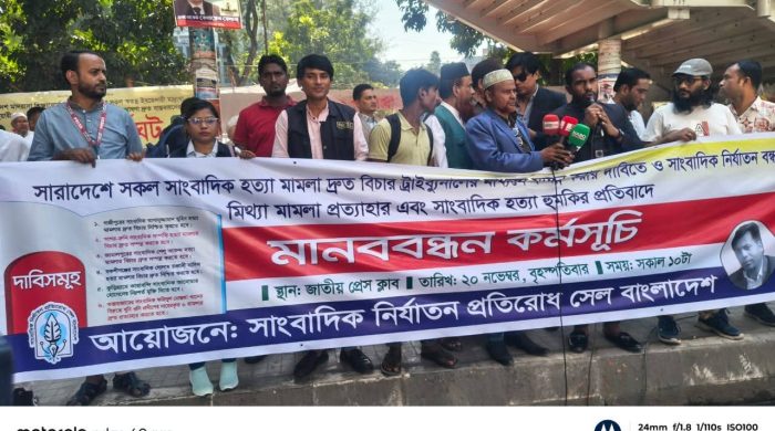 সারাদেশে সাংবাদিক হত্যা মামলার দ্রুত বিচার ট্রাইব্যুনালের মাধ্যমে নিষ্পত্তি, সাংবাদিকদের ওপর নির্যাতন-নিপীড়ন বন্ধ, মিথ্যা মামলা প্রত্যাহার এবং হত্যার হুমকির প্রতিবাদে মানববন্ধন কর্মসূচি পালন করেছে সাংবাদিক নির্যাতন প্রতিরোধ সেল বাংলাদেশ। বৃহস্পতিবার